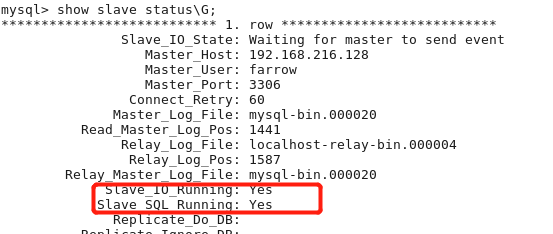CHANGE MASTER TO MASTER_HOST='192.168.216.128', MASTER_USER='sally', MASTER_PASSWORD='ilovesally', MASTER_LOG_FILE='mysql-bin.000020', MASTER_LOG_POS=1441;