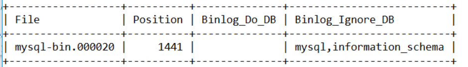 可以看到以上结果,这儿只需要看 File 和 Position,其它的两个分别是白名单和黑名单,意思为同步哪几个数据库和不同步哪几个数据库,可自行根据需求进行设置。记录了前两个字段后,在从库上执行以下语句: