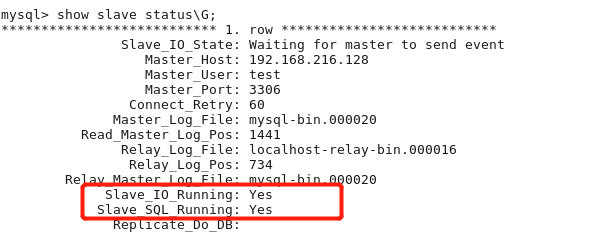 show slave status\G;同上,如果出现如下画面,则证明配置成功。