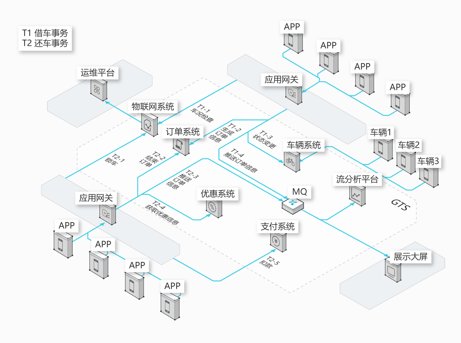 上图是GTS与SpringCloud集成,应用于某共享出行系统。业务共享出行场景下,通过GTS支撑物联网系统、订单系统、支付系统、运维系统、分析系统等系各统应用的数据一致性,保证海量订单和数千万流水的交易。