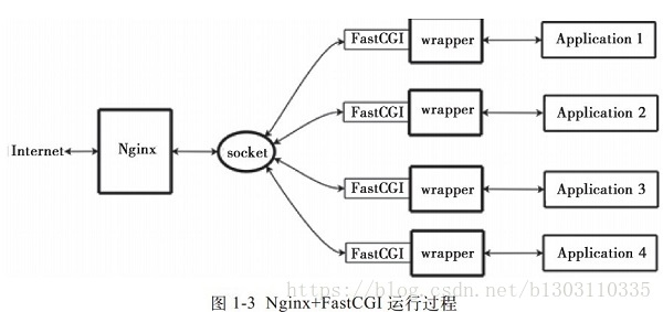 socket)。wrapper:为了调用CGI程序,还需要一个FastCGI的wrapper(wrapper可以理解为用于启动另一个程序的程序),这个wrapper绑定在某个固定socket上,如端口或者文件socket。当Nginx将CGI请求发送给这个socket的时候,通过FastCGI接口,wrapper接收到请求,然后Fork(派生)出一个新的线程,这个线程调用解释器或者外部程序处理脚本并读取返回数据;接着,wrapper再将返回的数据通过FastCGI接口,沿着固定的socket传递给Nginx;最后,Nginx将返回的数据(html页面或者图片)发送给客户端。这就是Nginx+FastCGI的整个运作过程,如图1-3所示。